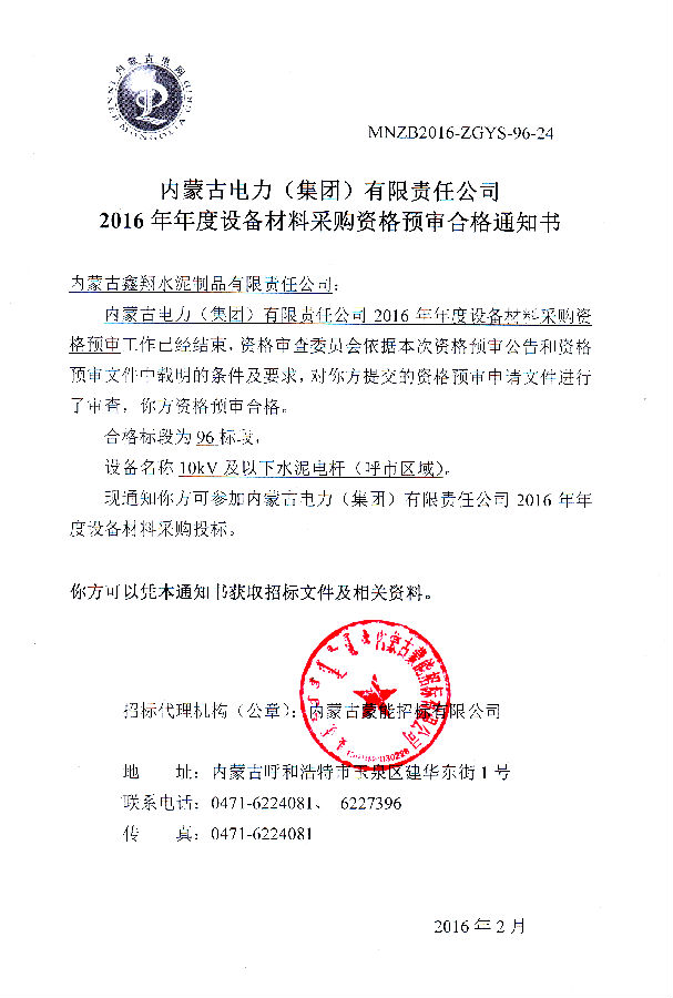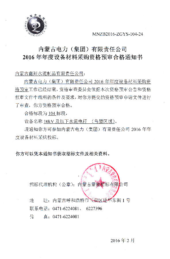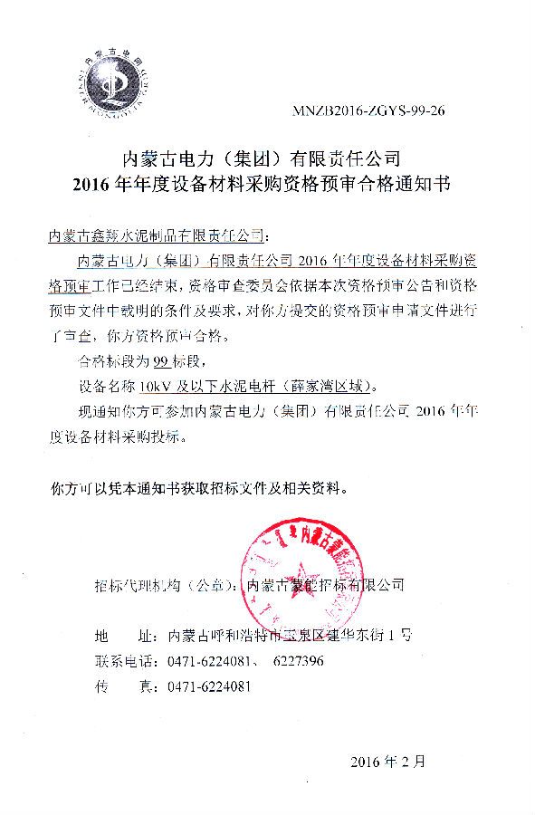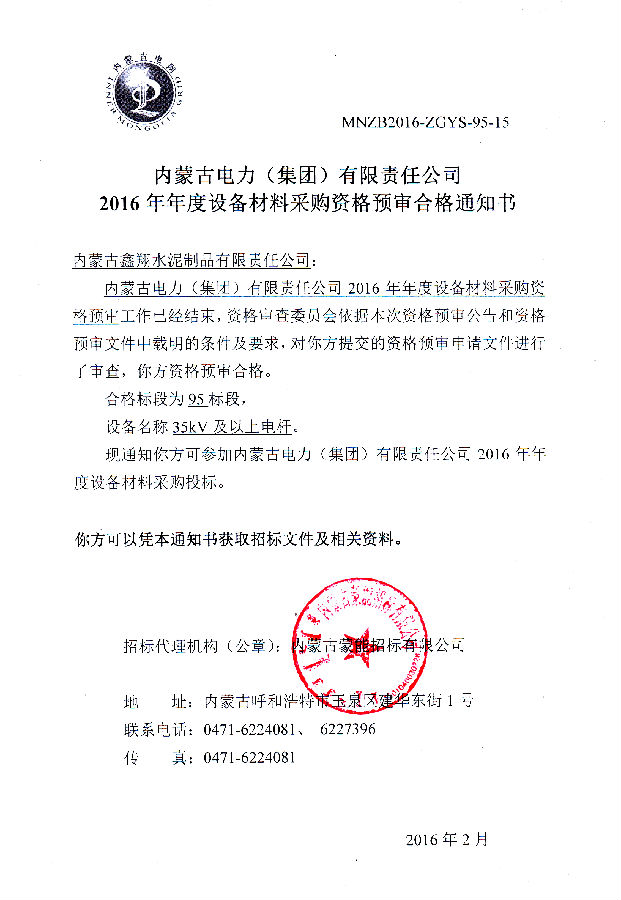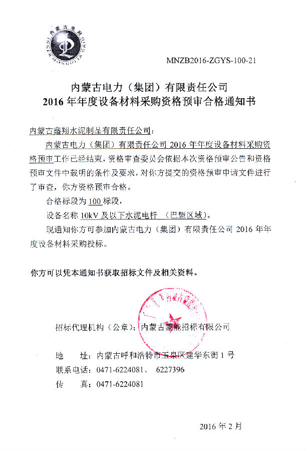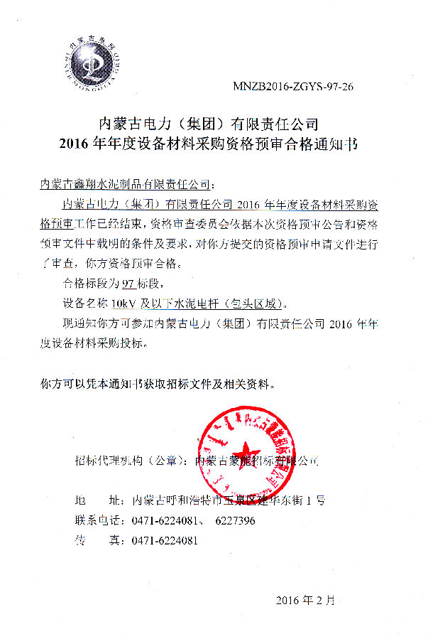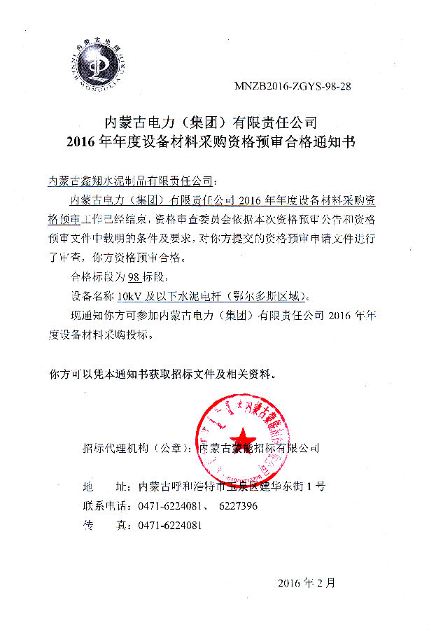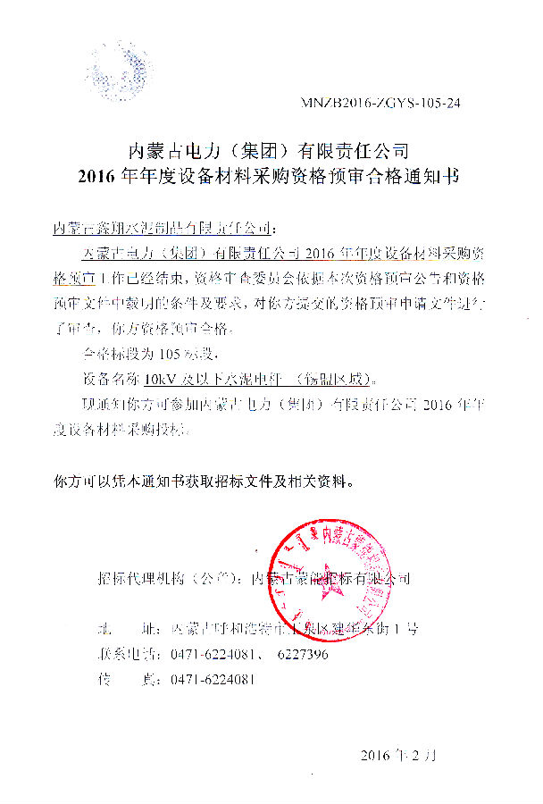 我單位榮獲《2016年度設備材料資格預審合格通知書》
