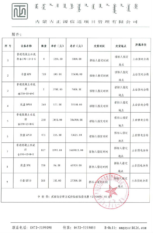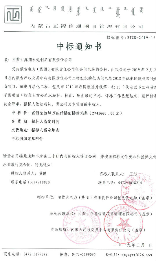 內蒙古電力(集團)有限責任公司包頭供電局中標通知書
