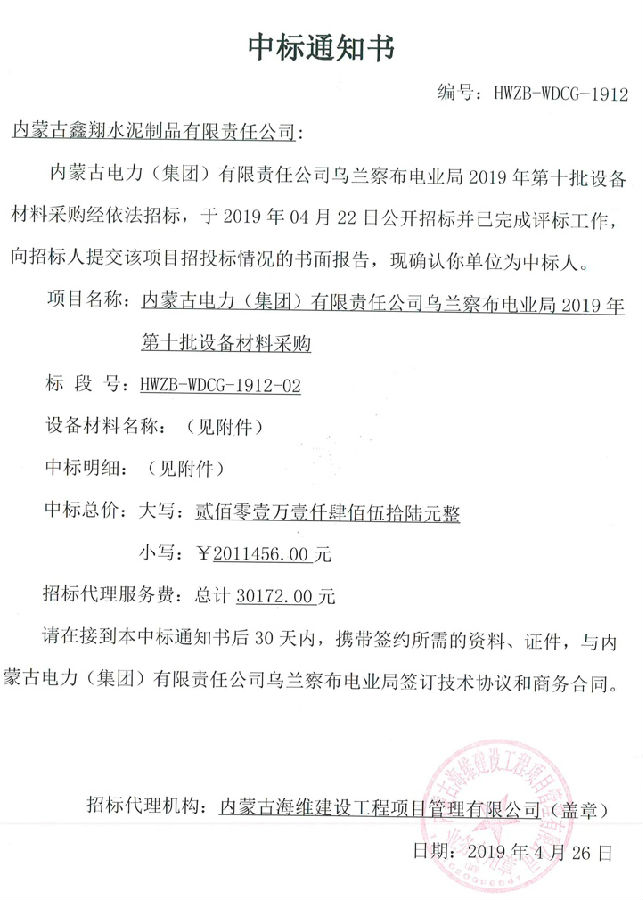 內蒙古電力(集團)有限責任公司烏蘭察布電業局中標通知書