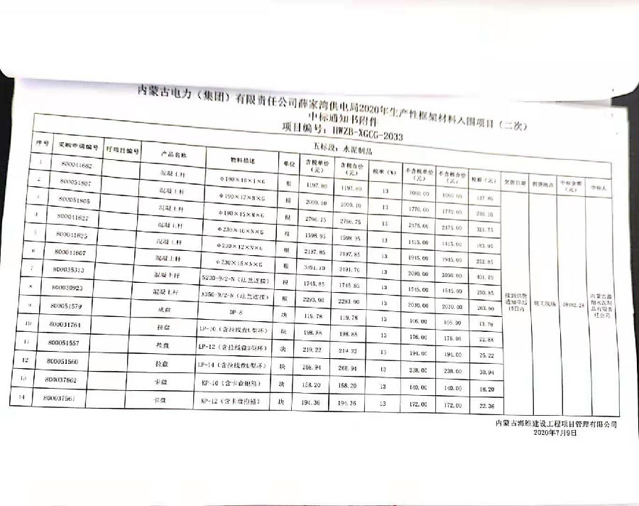 內蒙古電力(集團)有限責任公司薛家灣供電局2020年生產性框架材料入圍項目(二次)